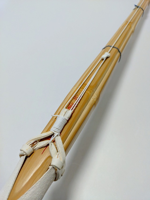 -この竹刀の特徴- 仕組み完成品とした竹刀です。(513g、柄革折返し下から柄頭まで約32㎝、吟ダブル柄革セット使用) ↓竹のみで計測 握りの太さ:左手Φ26㎜・右手Φ28㎜【中ぐらい】 剣先の太さ:Φ23.5㎜・ちくとう最小Φ24.5㎜【中ぐらい】 重心:柄尻から55.5㎝【中ぐらいの調子】 製作時重量:459g(※環境や季節などにより変動します。) 令和7年12月製作 日本海の厳しい気候に鍛えられた佐渡ヶ島自生の真竹材を使用し、伝統的な手造りの方法で製作した純佐渡産真竹竹刀【佐渡國直平(さどこくなおひら)】です。 打ち負けないしっかりした打突の力強さを求めた直刀型です。 厳しい環境で育った真竹材のため、表面には天然のキズやアザなどが入っている場合があります。品質には問題ありません。あらかじめご了承ください。 -納期について- ご注文後、一週間ほどで発送いたします。(ひとりで作業しているため、お時間をいただきます。ご了承ください。) -オプションのご案内- ・「名入れ」(手書きによる彫り入れ)を承ります。(無料) ご希望の方は、オプション選択画面で彫り入れる文字(5文字まで)を記入してください。 ※安全な稽古のため、日頃から竹刀の点検および手入れを行ってください。 全剣連お知らせ「竹刀点検と手入れの徹底について(お願い)」https://www.kendo.or.jp/information/20241220/ 《参考》手造り竹刀のこだわり ・痛みやささくれを軽減し、より強靭で耐久力のある竹刀になるよう、竹の繊維の曲がりを丁寧な手作業により矯めています。また、竹の最も強固な表皮を広く残すとともに、表皮の角を落とすように削っています。 ・相手の防具や竹刀自身へのダメージを緩和するとともに、すっきりとした竹刀になるよう、節を削り落としています。 ・打突の衝撃で上下の竹が左右の竹の間に入り込んで潰れてしまわないように、節の裏をある程度残しています。 ・竹どうしの合わせ面に接着剤やロウなどの潤滑剤は塗布せず、竹刀の表面(表皮以外)をサメ皮で磨き、椿油だけを表面全体にひと拭きして仕上げています。(竹がしなると竹どうしが擦れ合うため、軋み音が出る場合があります。) ・柄部分の強靭さを損なわず、重量を手元側に残してよりバランスが良くなるよう、繊維が詰まっている竹の表皮側をできるだけ残して削っています。 ・柄革が回ってしまうことを防ぐよう、柄部分の表面を滑らかにし過ぎないように仕上げています。