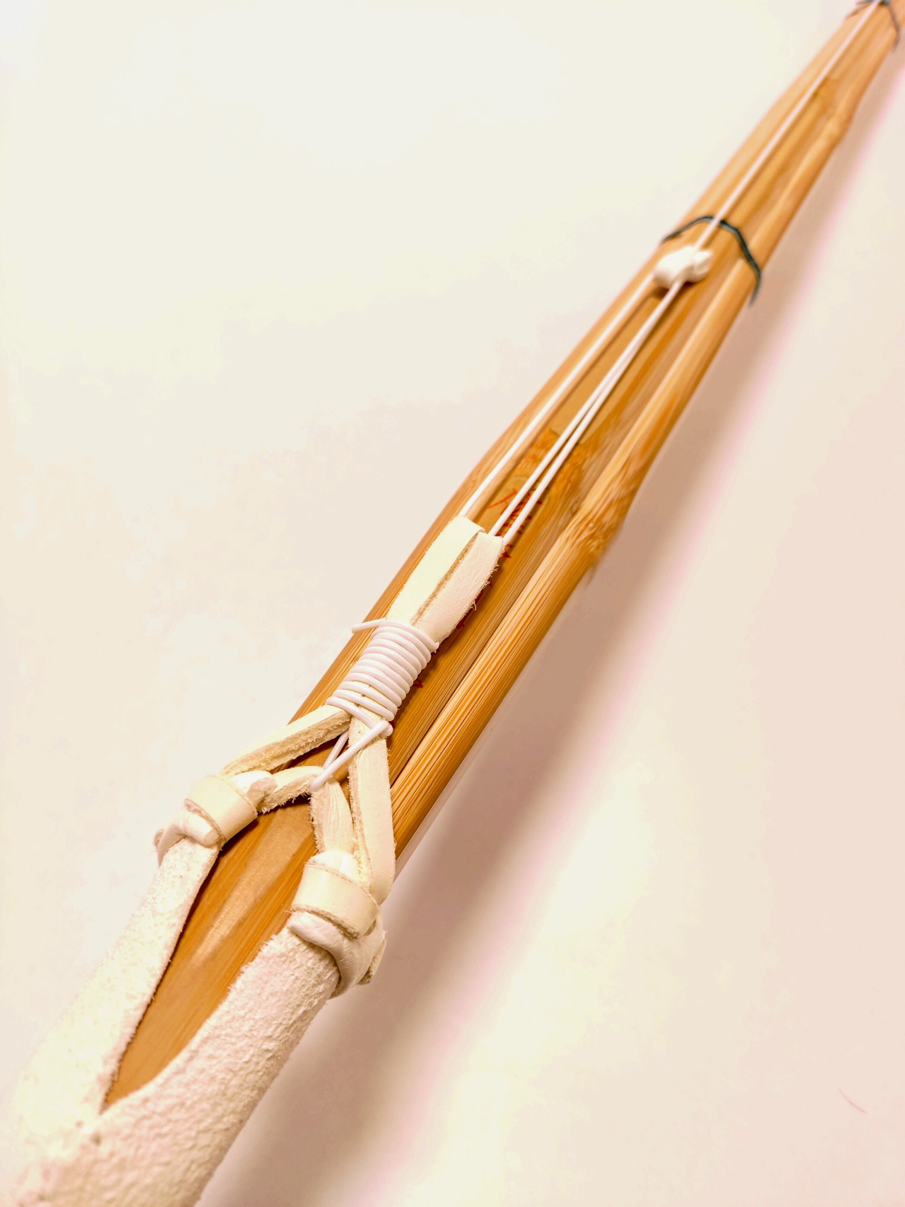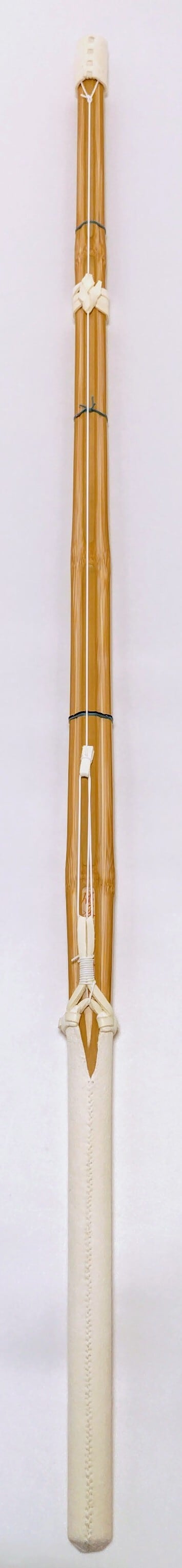 ・竹どうしの合わせ面に接着剤やロウなどの潤滑剤は塗布せず、竹刀の表面(表皮以外)をサメ皮で磨き、椿油だけを表面全体にひと拭きして仕上げています。(竹がしなると竹どうしが擦れ合うため、軋み音が出る場合があります。)