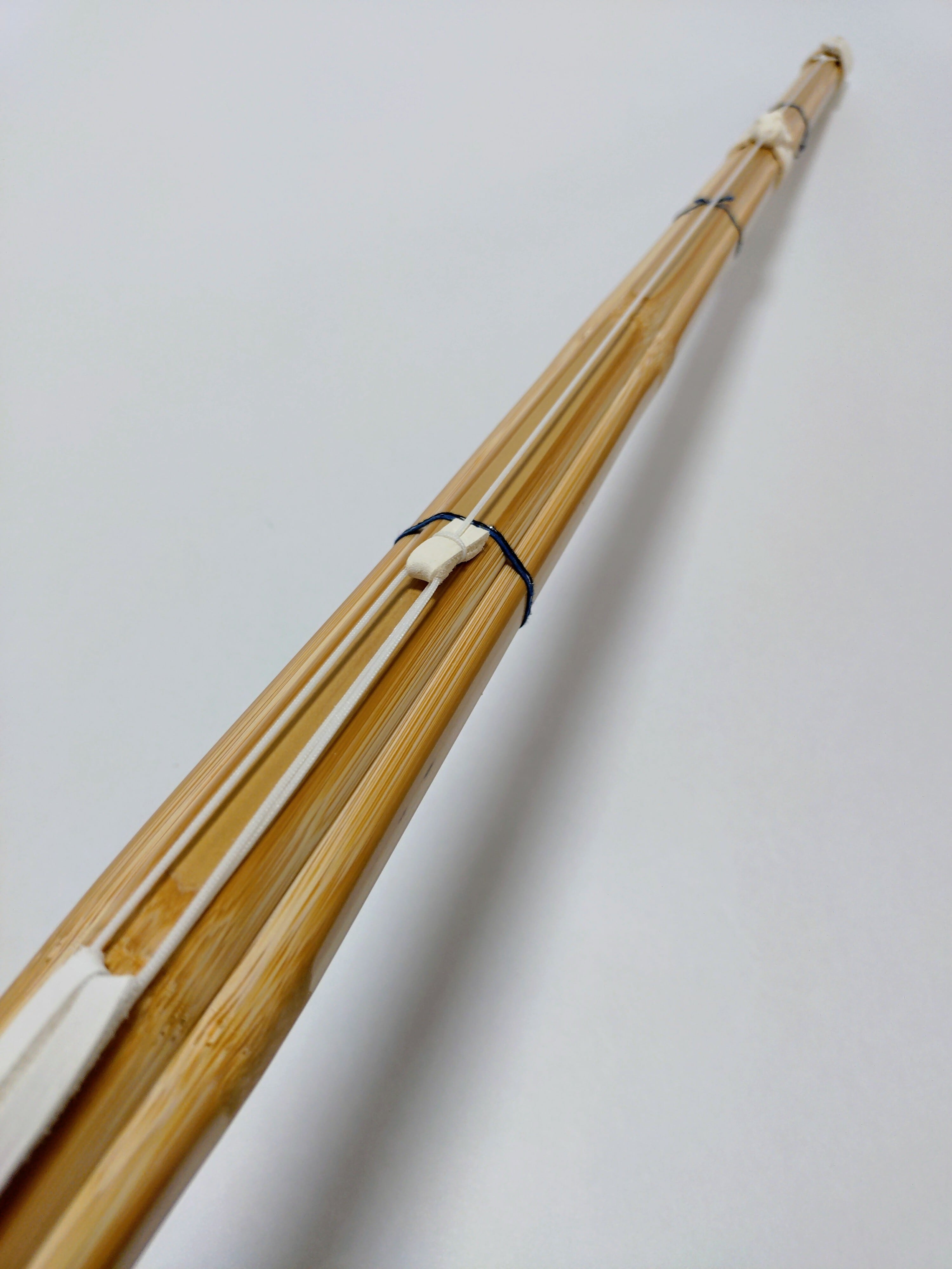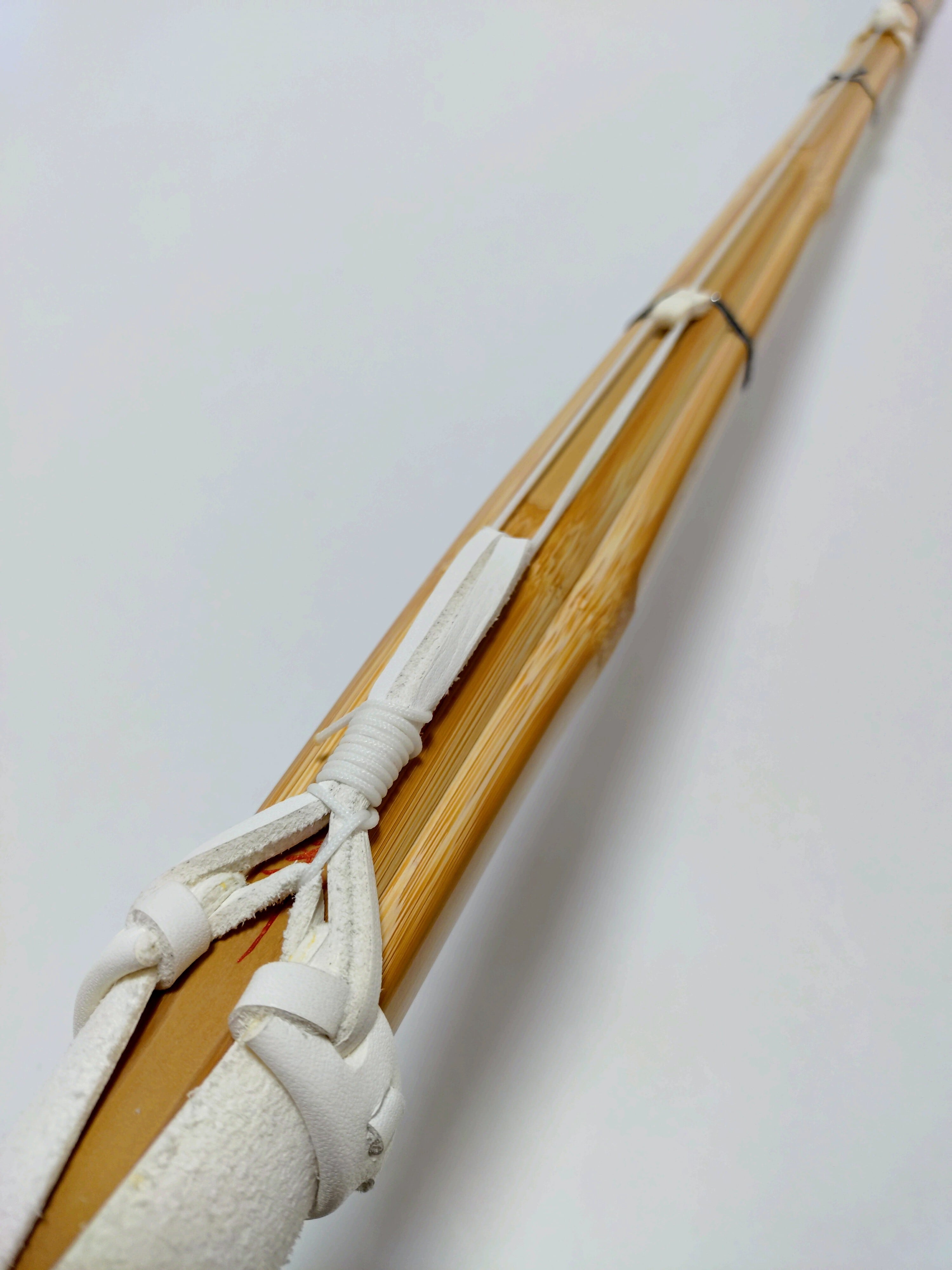 ・竹どうしの合わせ面に接着剤やロウなどの潤滑剤は塗布せず、竹刀の表面(表皮以外)をサメ皮で磨き、椿油だけを表面全体にひと拭きして仕上げています。(竹がしなると竹どうしが擦れ合うため、軋み音が出る場合があります。)
