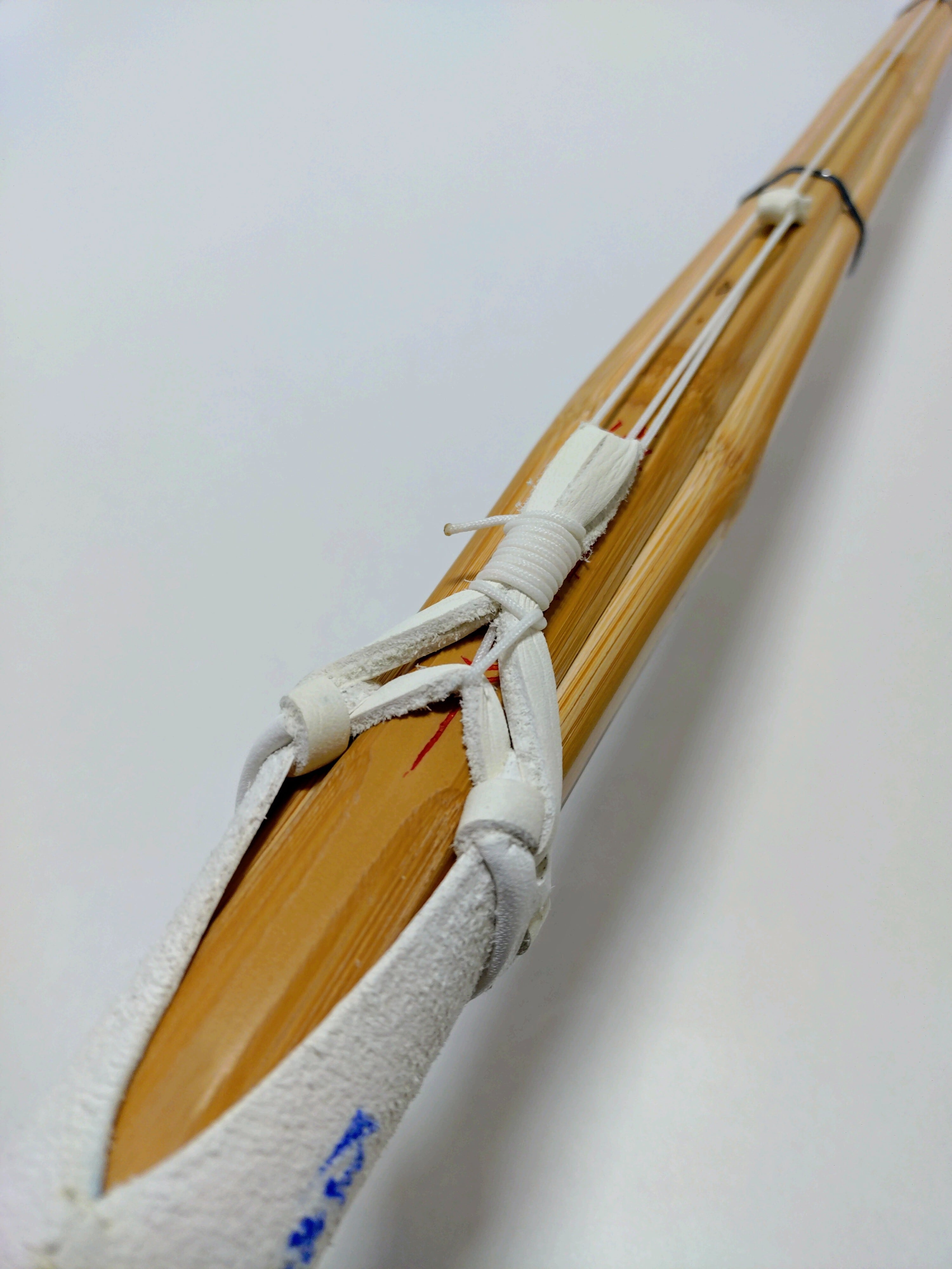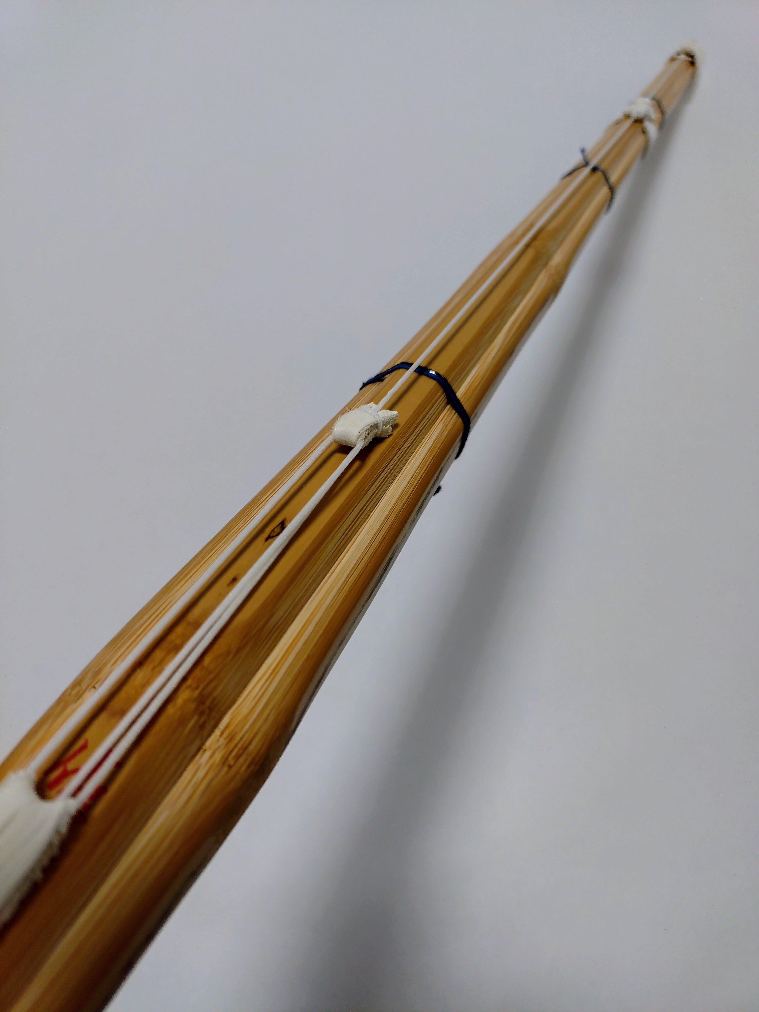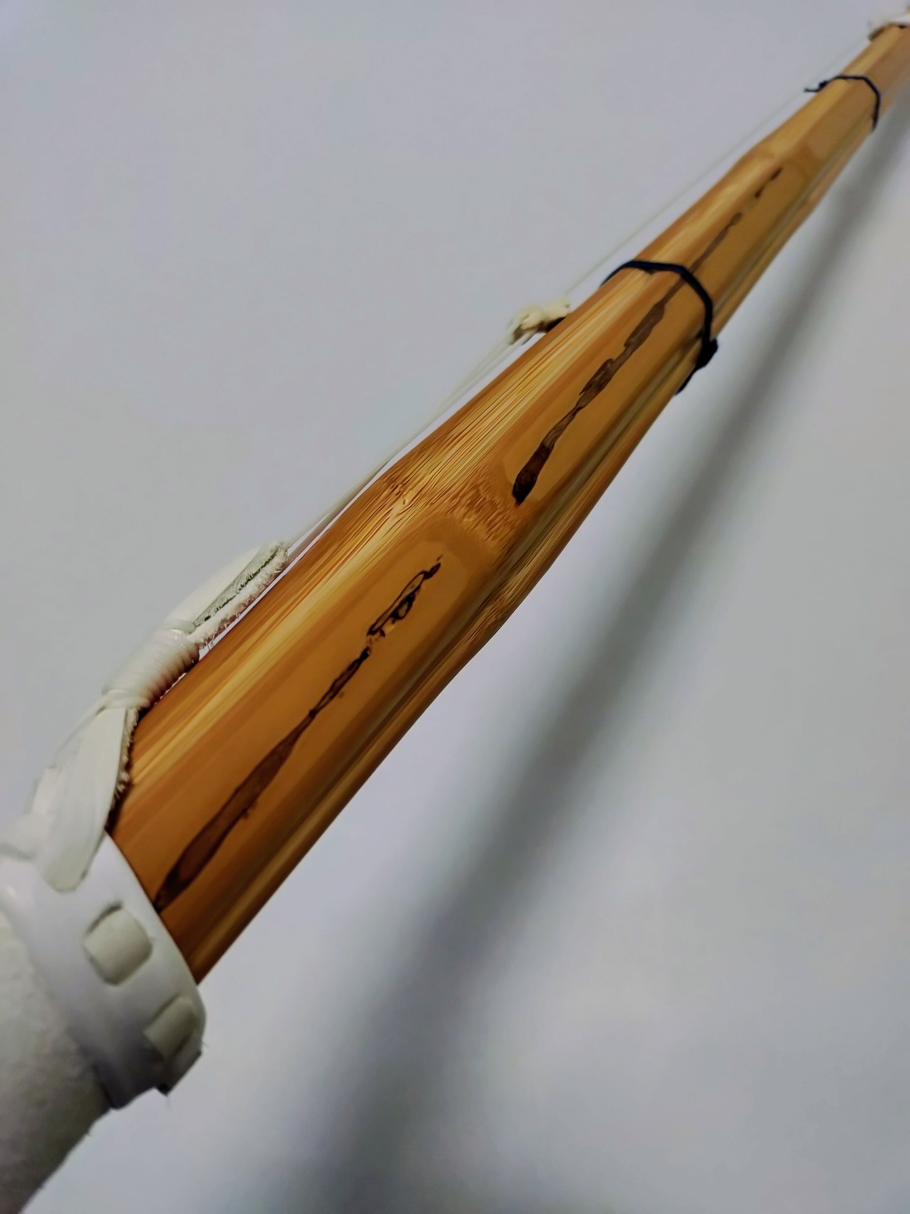 ・竹どうしの合わせ面に接着剤やロウなどの潤滑剤は塗布せず、竹刀の表面(表皮以外)をサメ皮で磨き、椿油だけを表面全体にひと拭きして仕上げています。(竹がしなると竹どうしが擦れ合うため、軋み音が出る場合があります。)