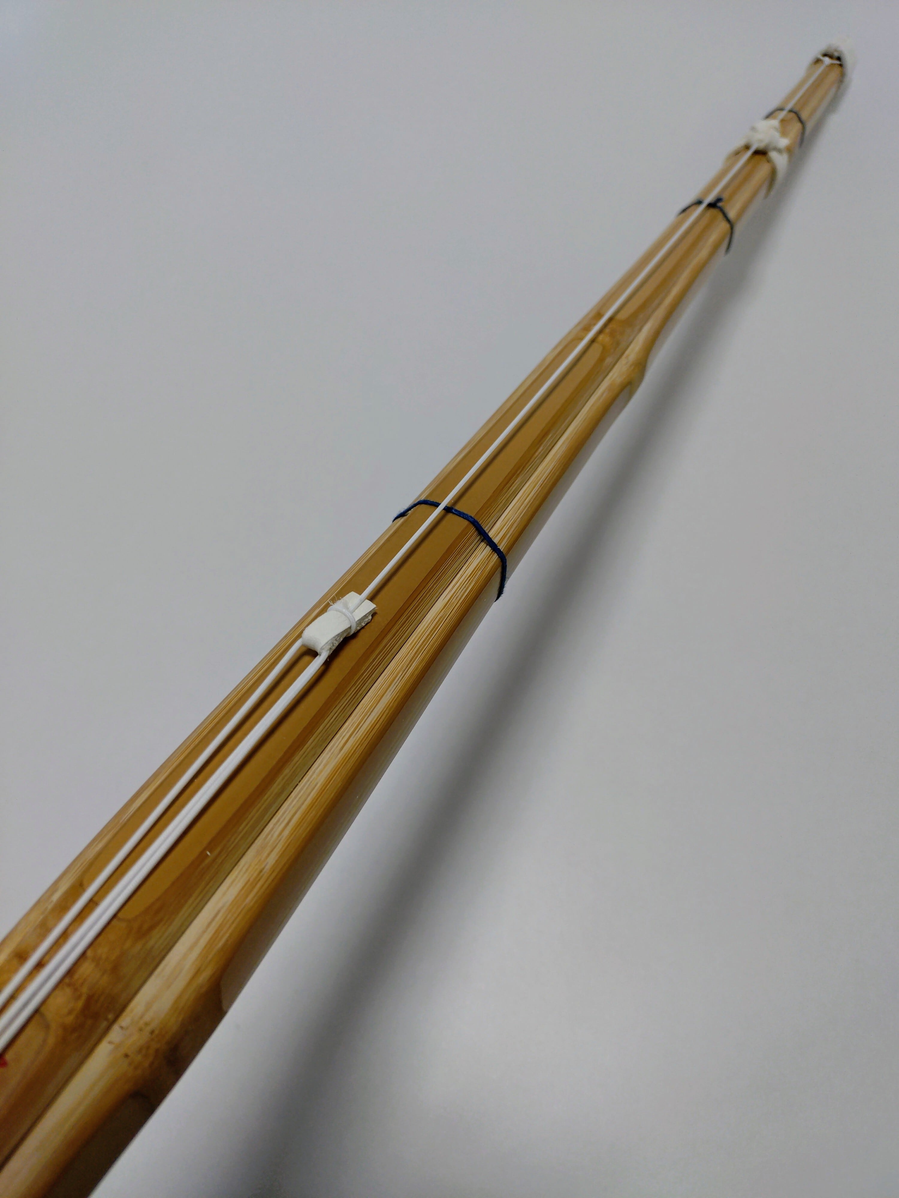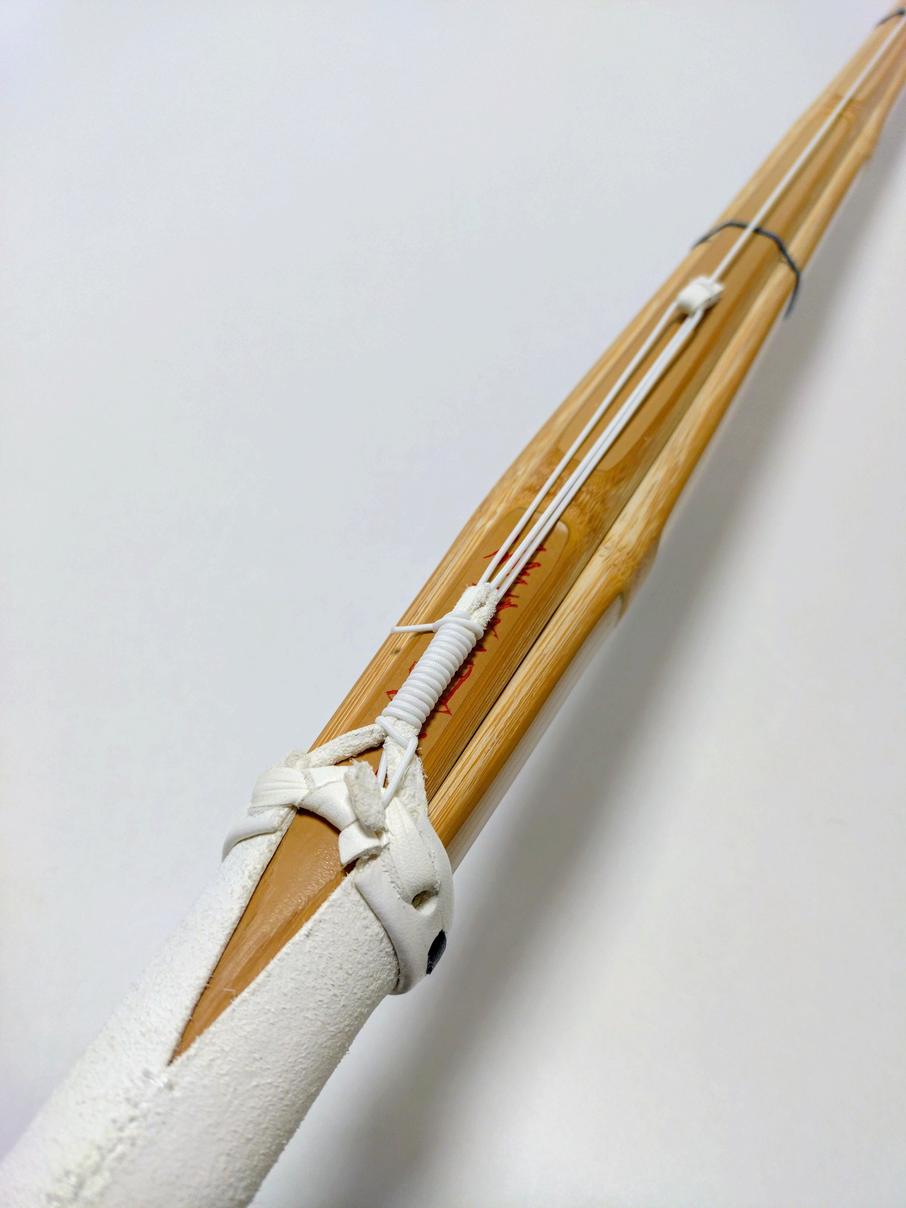 ・竹どうしの合わせ面に接着剤やロウなどの潤滑剤は塗布せず、竹刀の表面(表皮以外)をサメ皮で磨き、椿油だけを表面全体にひと拭きして仕上げています。(竹がしなると竹どうしが擦れ合うため、軋み音が出る場合があります。)