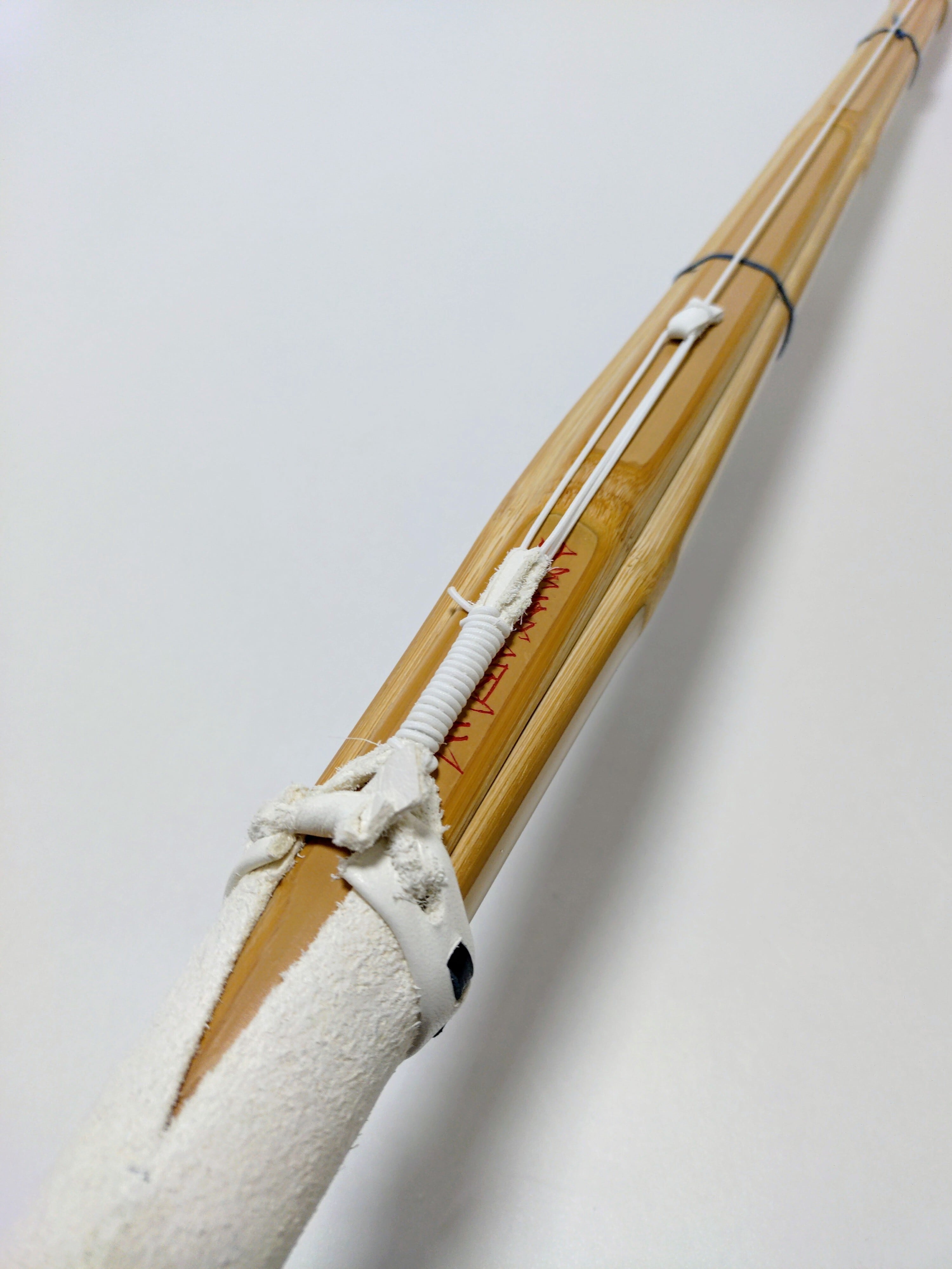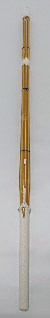 ・竹どうしの合わせ面に接着剤やロウなどの潤滑剤は塗布せず、竹刀の表面(表皮以外)をサメ皮で磨き、椿油だけを表面全体にひと拭きして仕上げています。(竹がしなると竹どうしが擦れ合うため、軋み音が出る場合があります。)